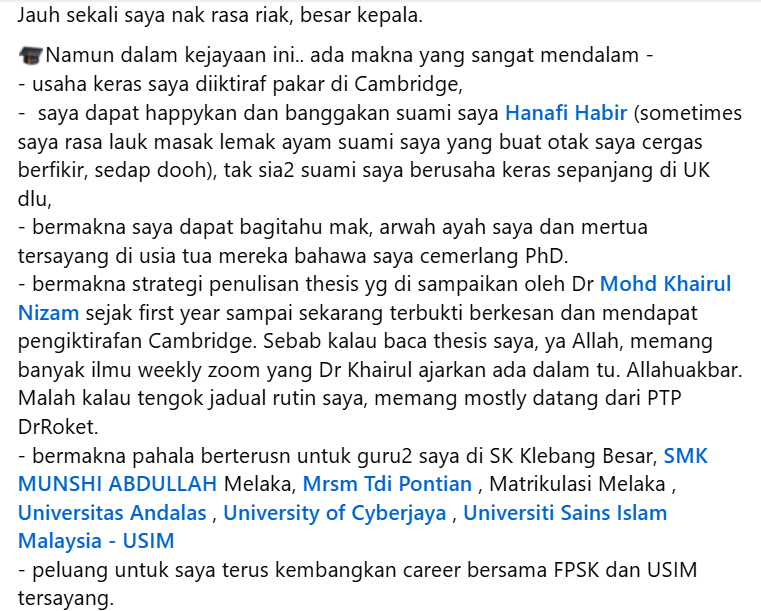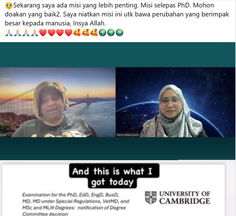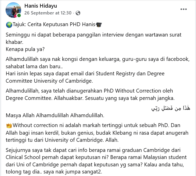 “Alhamdulillah Alhamdulillah Alhamdulillah… Dapat PhD Without Correction dari Uni of Cambridge adalah sesuatu yang sangat rare. Tapi tak mustahil. Saya dapat result rare ini kerana saya telah buat banyak perkara yang student Cambridge lain tak buat pun.. apa dia?