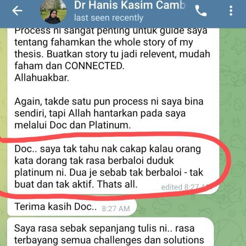 ”"Doc.. bila baca report ni kan.. saya tahu saya bukan student yg patuh. Tapi sebenarnya saya dapat Doa dari orang2 yang baik- mak saya, suami saya, guru saya - Doc, kawan2 platinum saya. Allahuakbar. Inilah platform mahal yg takde kat luar ni. Kalau ada org ke 2 buat modul yang sama, still impact tak kan sama sebab Doc letak soul dalam ni.. soul yg tinggi ilmu agamanya dan keyakinannya. Ada fakta yang tinggi valuenya. Allah bagi Doc kelebihan WISDOM tu. Terima kasih banyak2 Doc.. Allah pelihara Doc, Dr Mar, family dan team".