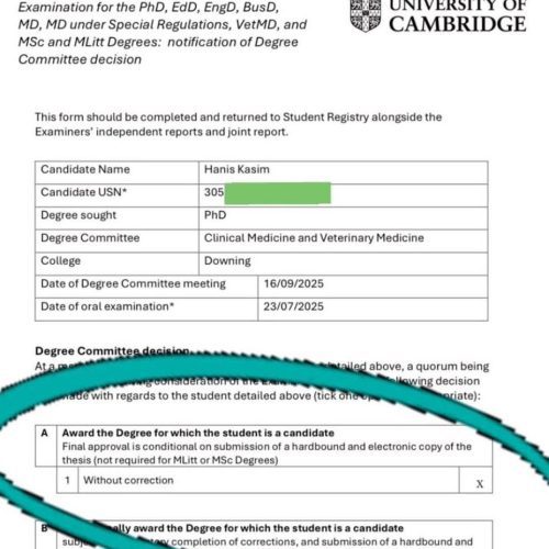 Dapat sesuatu daripada perkongsian berharga ini? Perjalanan ini mengajar Dr. Hanis bahawa setiap kejayaan bukan sekadar hasil usaha individu, tetapi hadir daripada doa, sokongan, dan proses yang betul. Beliau sendiri tidak menyangka Degree Committee (barisan profesor senior) dalam bidang Clinical Medicine dan Veterinary Medicine di Universiti Cambridge mampu mengubah keputusan yang asalnya hanyalah correction biasa.